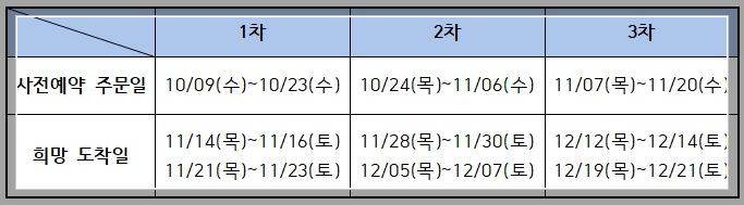 - 사전예약은 1차, 2차, 3차가 있습니다. 희망 도착일을 확인하시고 원하시는 날짜를 선택하실 수 있습니다.