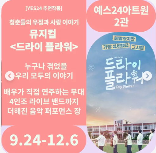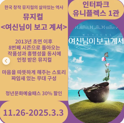 인터파크나 YES24 중 원하는 사용처를 선택하시고, 해당 지역을 선택하시면 관람 가능한 공연 정보가 있습니다.