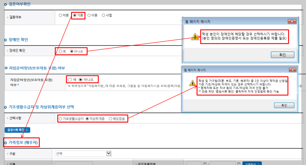 - 기초/차상위 : 신청일 기준 학생 및 가구원(미혼:부모, 기혼:배우자) 중 1인 이상이 자격을 보유하고 있는 경우에만 선택