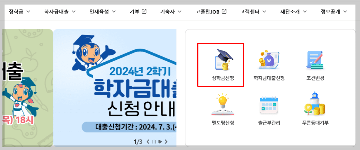 1. 먼저 한국장학재단 홈페이지에 접속합니다. '2025년 1학기 국가장학금 1차 신청'을 클릭하시고, 다음 화면에서 '장학금 신청'을 클릭합니다.