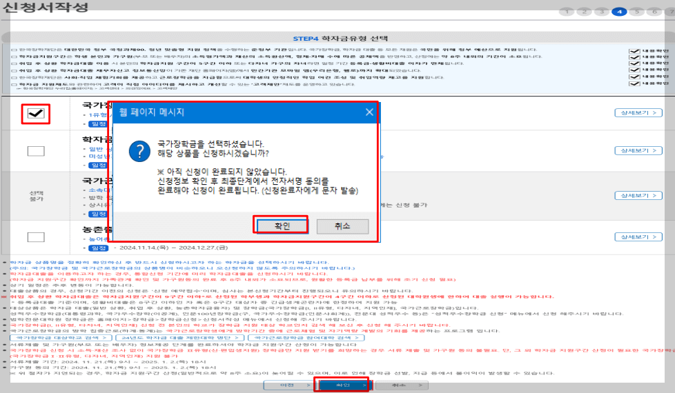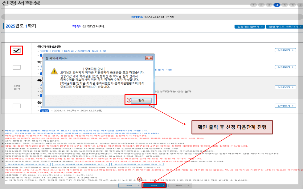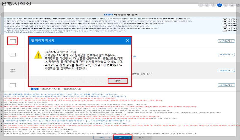 7. 국가장학금 한눈에 보기는 필수 단계이므로 미확인 시 진행 불가합니다.