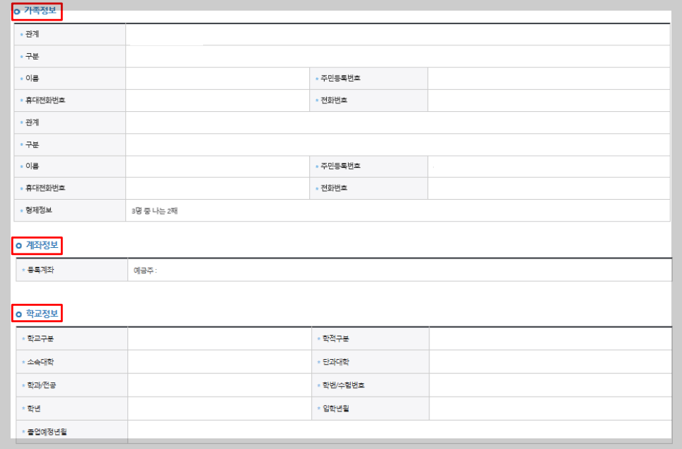 - 형제/자매 수 및 서열에 따라 국가장학금 지원 가능금액에 변동이 있을 수 있으므로 반드시 정확한 정보 입력