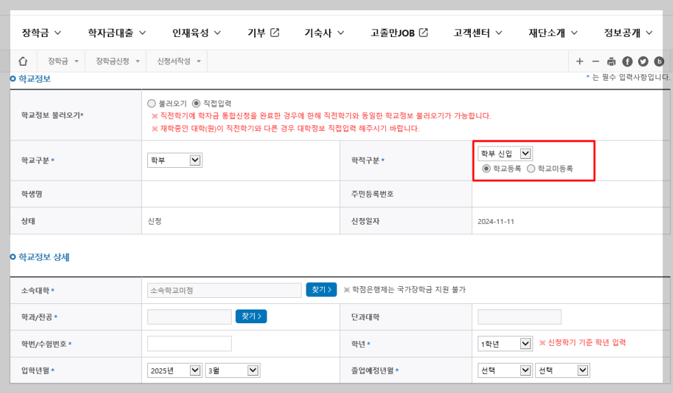 - 학적구분 : 1학기 학부 신입생으로 국가장학금 신청 시, 대학 정보 입력여부와 상관없이 소속대학 미정으로 처리되며, 3월 이후 대학에서 등록하는 신입생 최종등록 정보로 심사 진행