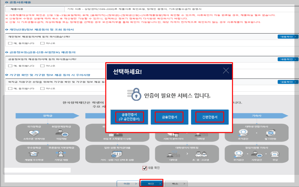 - 국가장학금 신청을 위해 공동인증서, 금융인증서, 민간인증서(카카오, 페이코, KB국민은행 등) 등 필요