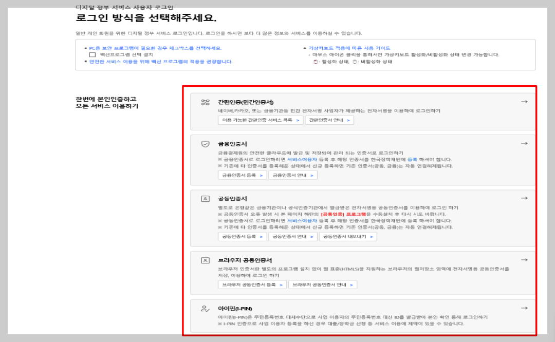 - * 우리, 국민, 신한, 기업, 경남, 농협, 광주, 대구, 부산, 수협, KEB하나, SC제일, 전북, 제주, 우체국, 케이뱅크, 카카오뱅크, 토스 - (금융인증서) 해당 금융회사 인터넷뱅킹 홈페이지에서 발급 가능 - (민간인증서) 카카오, 네이버, 신한은행, 이동통신사 PASS, KB국민은행, 페이코, 삼성 PASS, 토스, 뱅크샐러드, 하나은행