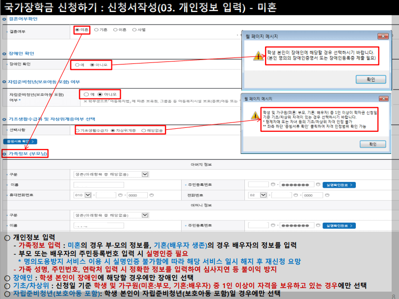 - 가족정보 입력 : 미혼의 경우 부·모의 정보를, 기혼(배우자 생존)의 경우 배우자의 정보를 입력